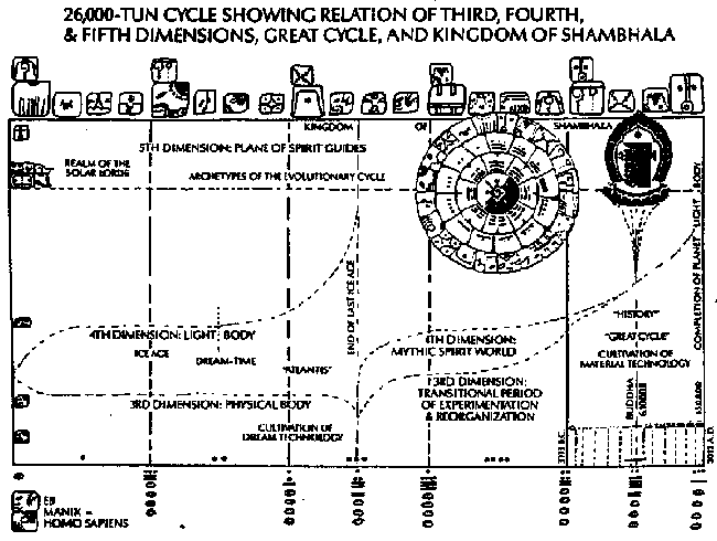 There have been many projected dates for the ending of the Mayan calendar, ranging from 1957 to 2050. The 2012 end-date was defined by the Thompson Projection. Thompson's projection used a day-by-day count to cross -reference the Mayan to the European calendar rather than a count of years. This bypassed the problem of year names in the Gregorian system. Jose & Lloydine agreed with Thompson's 2012 date. More importantly, the 2012 date works with the hard facts evidenced by the accuracy of the July 26, 1992 Time Shift. Terence McKenna and Peter Meyer's Timewave Zero software that graphs time as a fractal demonstrates by graph the accuracy of the winter solstice of 2012 as the correct end-date of the Mayan calendar with graph anomalies appearing in the months of July. Beyond the stargates of this planet and solar system lies a cosmic scheme of underlying order in which the earth's flow of history unfolds in patterns of time. Galactic travelers have long traversed the corridors of time and space, and peri odically visited this solar system. The evidence of archaeological ruins on Mars and the moon are mute testimony to the presence of intelligent builders in now ancient history. The evidence is clear. Someone with advanced knowledge of astronomy has visited peoples of this planet and left calendars as a signature note. This is discovered in correspondences of world calendars: Mayan, Tibetan, Afri can, Vedic, and Hebraic. Similar calendar schemes are found in each of these cultures. The European calendar mandated by Pope Gregory in 1583 is the only world calendar that did not intercalate at least two celestial cycles. The Hebraic calendar acquired by Enoch after he was translated in a beam of light intercalated solar and lunar cycles in a fashion similar to the Maya. The Dogon in Africa were given four calendars by visitors from Sirius B: Solar, lunar, Venu sian, and civil. The Tibetan calendar is so similar to the Mayan that traditional scholars now speculate that they share a common origin. The Vedic calendar is based on cosmic cycles, or Yugas. An ancient Hindu astrology used 27 houses of 13 degrees 20 minutes, which are key numbers in the Mayan calendar. These calendars provided a time management tool that synchronized planetary cycles with visits from the stars. The Dogon calendar identified the 12 or 13th Century as the date of last visit; the Mayan calendar identified July 11, 1991, as an upcoming date of visit. Both of these dates coincided with significant planetary cycles. The cultures visited by the Galactic Maya were shamanic. Ancient Hebraic instructions for building altars and using precious and semiprecious stones are identical to those used by Native Americans. The ancient Tibetans were shamanic. The Dogon and Maya are shamanic. The Galactic Maya were shamanic.